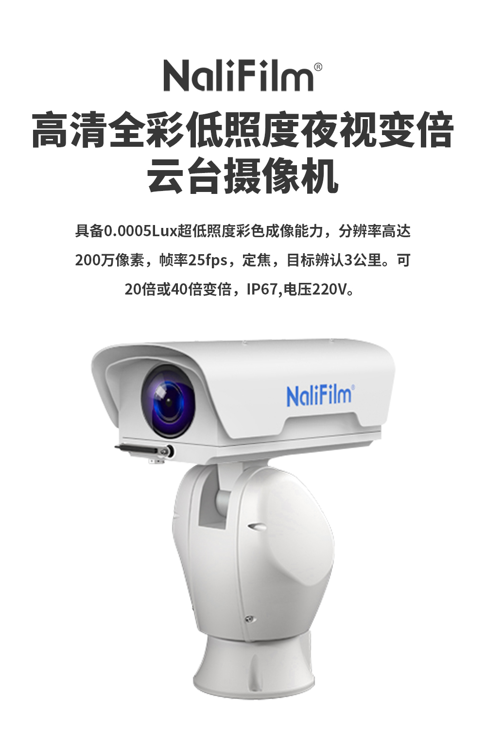 全彩夜视云台摄像机(40变倍),昼夜两用,在极低照度下可实现全彩成像超距识别,无需补光。 聚焦速度快,超强光抑制。主要应用城市高空瞭望边海防、海上卡口、道路监控、海上养殖、公园、工业园区等场所。全彩夜视云台是在极弱光成像技术的基础上,通过从极弱光信号中分离噪声和真实信号的深度学习AI算法:在降噪的同时将真实信号增强至正常光环境强度,信噪比得到有效提升,实现了在极弱光环境下的正常成像。防水等级IP67同时支持防雷、防浪涌、防电磁冲击。